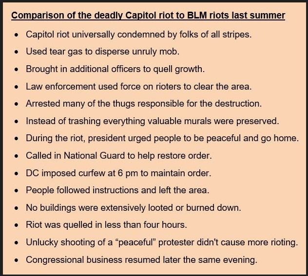 Those who rioted on Jan 6th were wrong and deserved to face justice as they have. To the casual observer though, the difference in the way Jan 6 rioters (and some innocent protesters) were arrested and prosecuted compared to the lax treatment of BLM rioters was stark. Many who entered the Capitol were not violent and merely followed a crowd that in some cases was even guided by law enforcement through the building. Most were seeking a CONSTITUTIONAL REMEDY similar to this one to a deeply flawed election, not a coup.