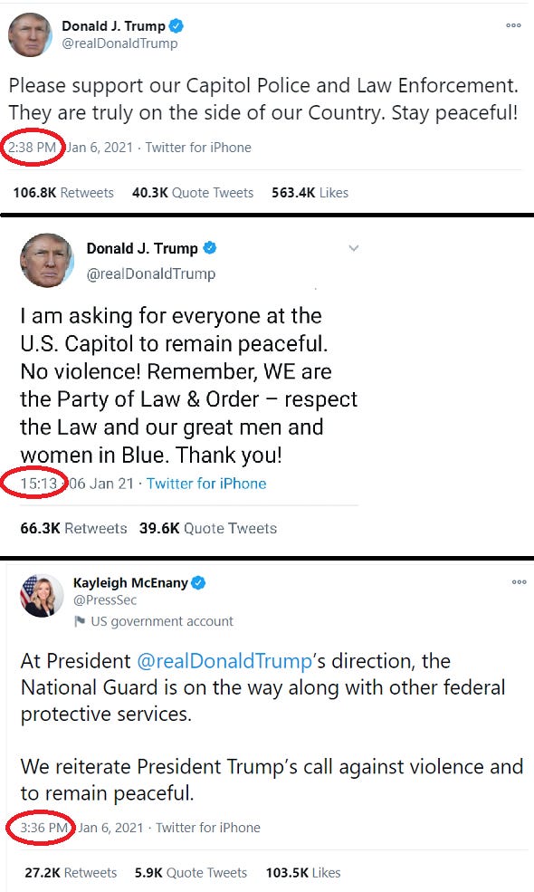 Trump's proactive request for the DC Mayor or Nancy Pelosi to request National Guard presence to prevent violence due to the large crowd expected (some known to be agitators) was ignored and not presented at the trial. In subsequent days more evidence was presented by conservatives that raised questions about the degree of Trump's complicity in the violence and whether it was really an insurrection.