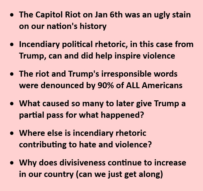 In summary, the Capitol Riot on Jan 6th was an ugly stain on our nation’s history. Incendiary political rhetoric, in this case from Trump, can and did help inspire violence. The riot and Trump’s irresponsible words that morning were immediately denounced by nearly all Americans, republicans and democrats alike. However, looking at the demonstration and the riot more holistically in comparison to other politicians who’ve denounced unfair elections and incited angry crowds, views on Jan 6th have changed for many. The divisiveness that’s so prevalent in our country is counterproductive to achieving our collective national goals and the good news is that more folks are asking the question- why can’t we just get along.