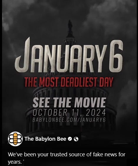 The way Jan 6th was blown up EVEN LARGER than it was wound up inspiring The Babylon Bee to put out "The Most Deadliest Day" which is free to view.