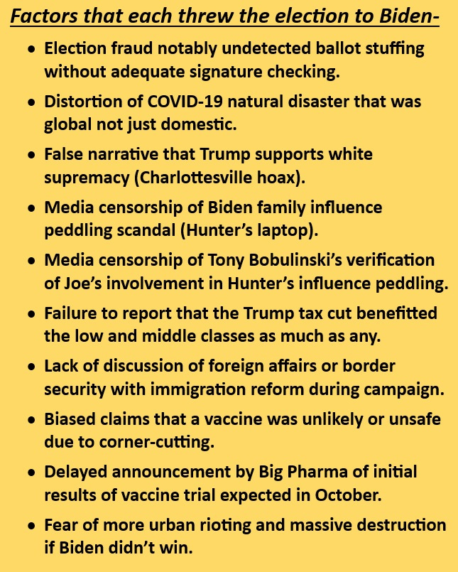 The motives for folks who protested George Floyd's murder the previous year were good, and it wouldn't be fair to blame those peacefully protesting for the rioting conducted by some of them. Likewise the large crowd that gathered on Jan 6th to protest what they saw as a deeply flawed election for a number of reasons were justified in peacefully voicing their opinions too. Let’s show the same ability to distinguish unlawful rioting from peaceful protesting in both cases. Let’s be consistent with the peaceful occupation of the Wisconsin State Capitol 10 years earlier that was encouraged by Democrats as we separate peaceful from violent protesters. This list was prepared after the election but before Jan 6th to help motivate peaceful protesters to advocate for a constitutional remedy to what happened.