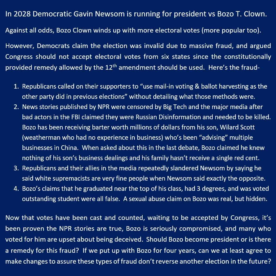 Regarding the root cause of Jan 6th, one way to evaluate confirmation bias is to examine scenarios where the shoe is on the other foot, and I often ask friends how they would react if this plays out in 2028. Would they accept such a flawed election or would they seek remedies? Peaceful and constitutional remedies.