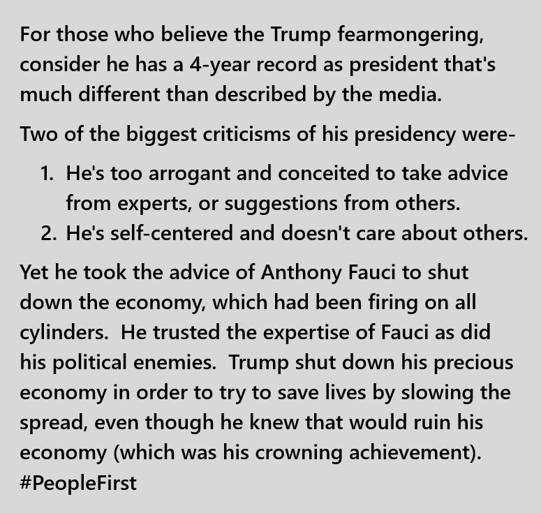 During the impeachment controversy, COVID-19 struck in the fall of 2019. Trump tried to slow the spread by restricting travel from China and other infected countries but democrats claimed xenophobia so restrictions were abandoned. In the early weeks of the developing pandemic, Nancy Pelosi invited people to come visit San Francisco and in March New York City mayor Bill de Blasio invited folks to ride the subway even though the virus was spreading at an alarming rate. At the same time government officials in New York and Michigan approved moving sick patients into Nursing homes where they infected other vulnerable people. Trying to strike a balance between calming the public vs panic, President Trump issued statements both of calm and action not unlike messaging during The Blitz in England, yet he was mocked for not taking the pandemic seriously never mind the drastic actions he took.