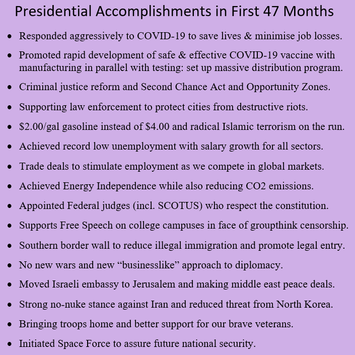 In 2016 Trump bested all 15 of his Republican primary opponents, and in the November election he defeated Hillary Clinton to become the 45th President of the US. His first term saw enhanced economic opportunity that resulted in record low unemployment with real salary growth for all sectors, as well as energy independence and world "peace through strength" although he was undermined by political enemies claiming he was an illegitimate president and harassing him with fake Russian Collusion and Steele Dossier hoaxes, not to mention impeachment.