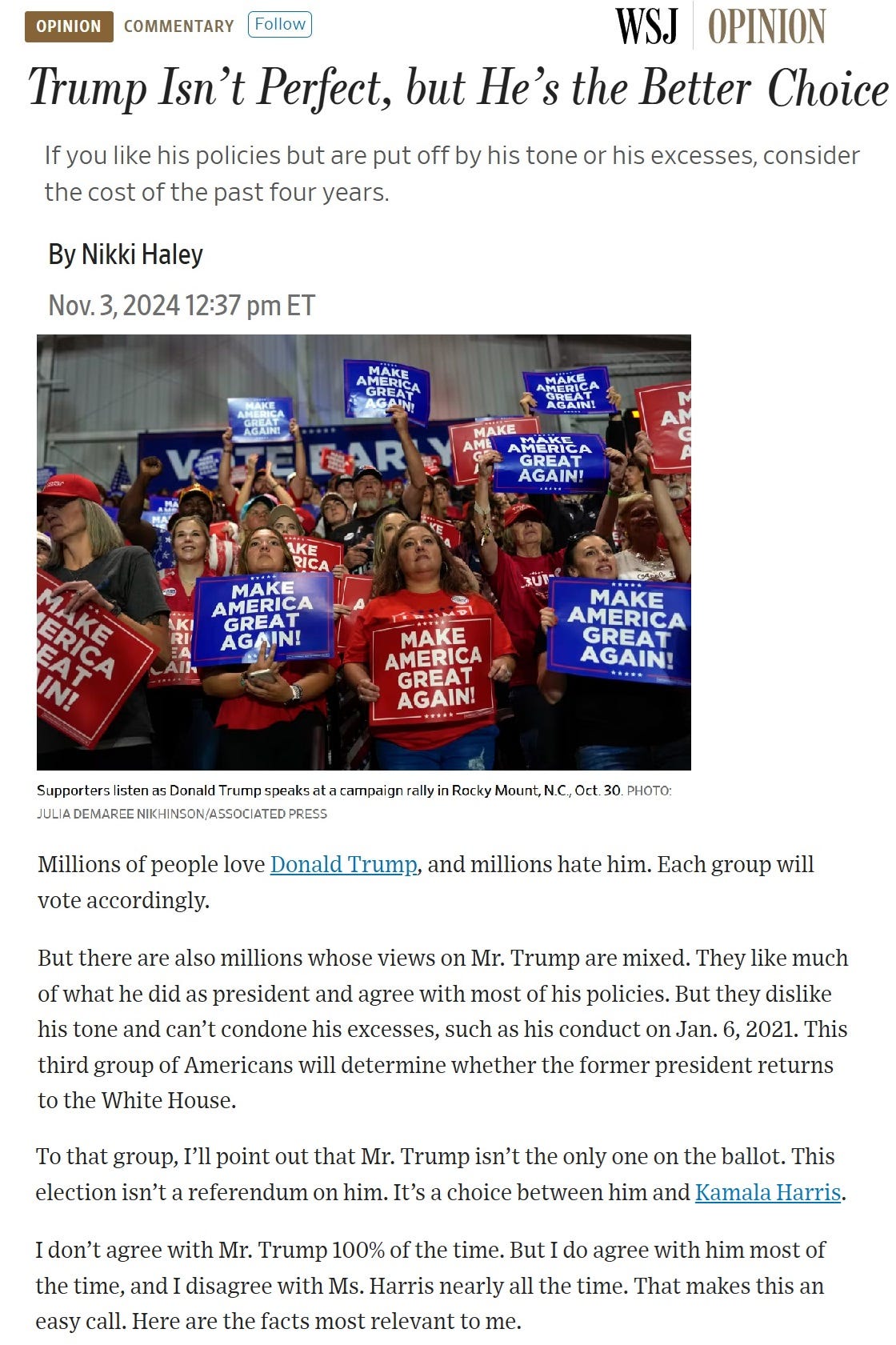 Nikki Haley re-iterated and amplified her endorsement of Trump in this excellent Wall Street Journal opinion piece.