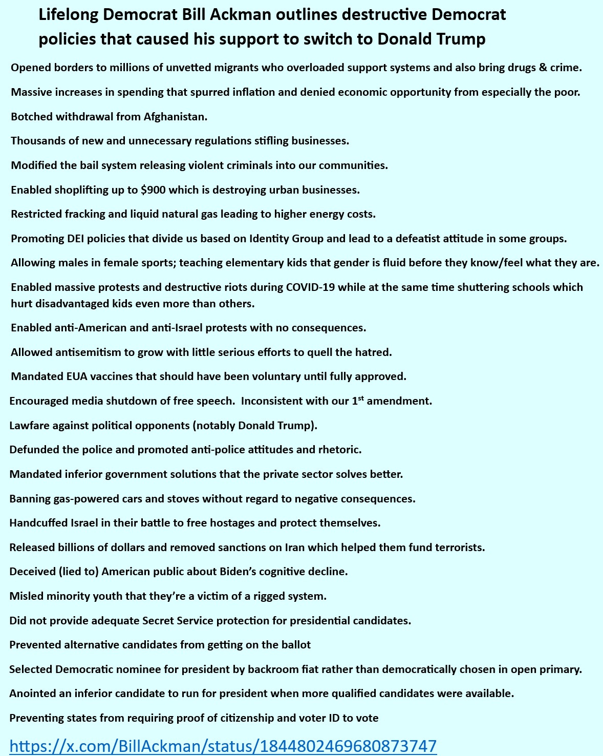 Notable lifelong democrats like Bill Ackman announced their support of Trump while Ackman also denounced the impact of democratic party policies in recent years.