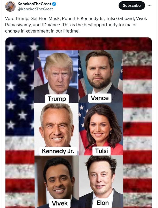Trump assembled an ideologically diverse team of intelligent democrats, libertarians, and Republicans ready to serve their country. On the ethnicity front, that type of diversity too, with RFK Jr (Irish American), Elon Musk (African American), Tulsi Gabbard (Samoan and European-American), Vivek Ramaswamy (Indian American), JD Vance (Scottish-Irish American), Tim Scott (African American), Nikki Haley (Indian American) and perhaps another libertarian in Ron Paul, with both the presidential and VP candidates married to legal immigrants. Most importantly, good problem solvers all.