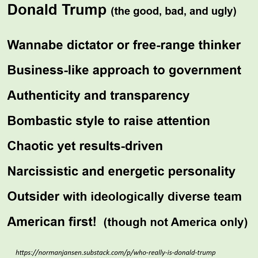 Trump tried to “drain the swamp” during his years as president but the “Administrative State” in Washington DC is deeply entrenched, and wasteful spending and ineffective policies are prevalent. This is why primary voters favored the brash bombastic style of a fighter like Trump over the candidate with more refined comportment like Haley even though she’d make an excellent president. Trump’s authenticity is appreciated by many, as is his transparency. He lets us know what he's thinking and he's not two-faced about it the way Harris is (and most politicians are). It’ll take a strong candidate to clean up DC.